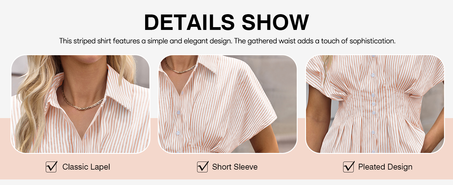 - Features: Button down shirts, striped lapel collar blouses, pleated waist with peplum hem, batwing short sleeve, trendy casual tops for women.